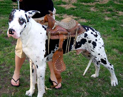 Bogart's grandpa deals in antiques and he saw this saddle in a store and thought it would be cute to see how it looked on Bo so he asked to borrow it to take his picture. Now you can see what a saddle really looks like on a Great Dane!