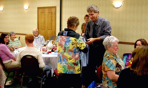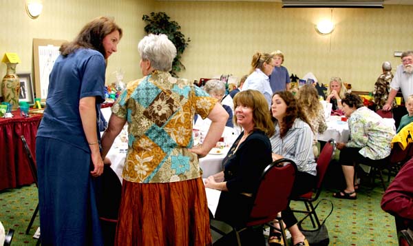 Kirk Kenney in the front on the left and Gene Kruckenberg behind him. Jen Kruckenberg standing talking to Lynn Cooch. Monica Alves is on the left sitting down.