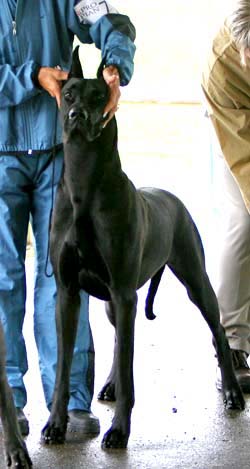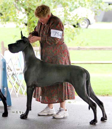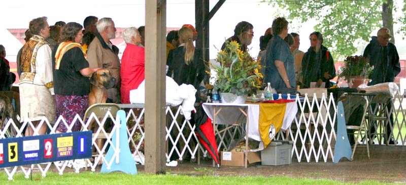 How many people, AND Great Danes, can you squeeze under a steel canopy in the rain at just one end of the ring? This photo was taken from the other side of the ring that we were SUPPOSED to be in, from under an E-Z Up awning. Do you see the rain coming down? Hey folks, you are looking the wrong way!! Over here! It's a test! How many people can you actually identify?