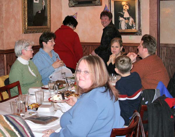 Leslie Belz cutting cake, Kymm Cowley and her mother Mary Ann Cowley sitting on the left side.