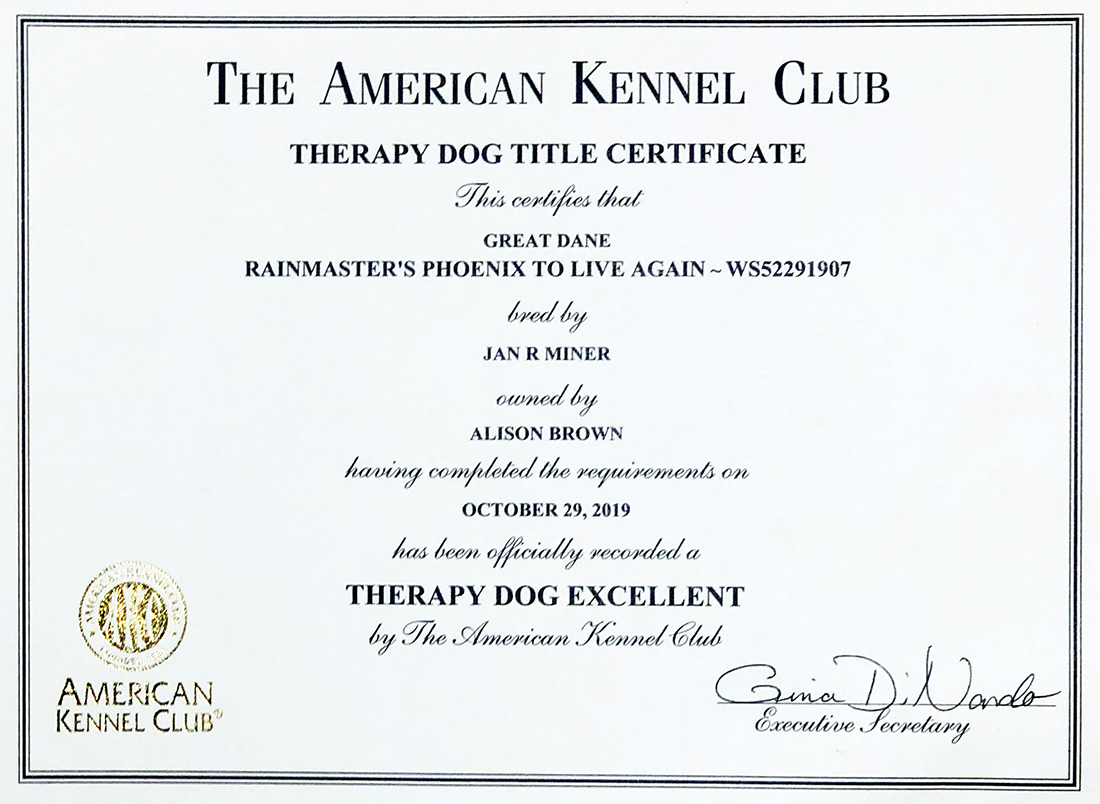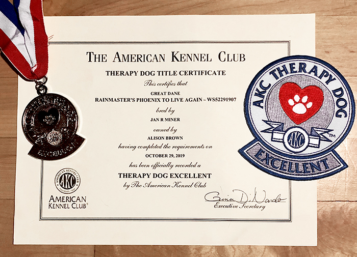 Awards, Title and Patch for Phoenix' Therapy Dog Excellent achievement