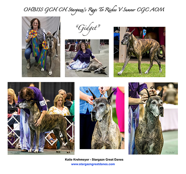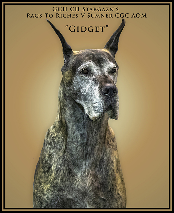 "Gidget" OHBISS GCH CH Stargazn's Rags To Riches V Sumner CGC AOM May 02,2009 - September 28, 2021 Bred by Katie Krehmeyer & Fay Rogstad Rojon's Without Reservation x CH Sumner's Canon in D v Alpine CGC