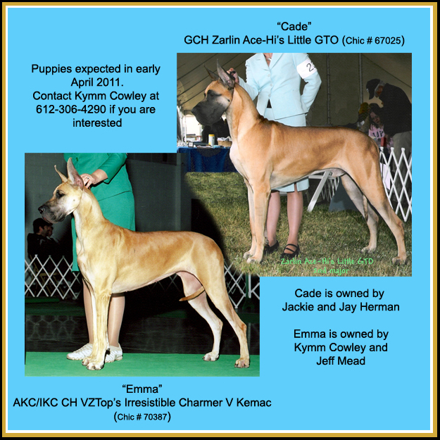 CH VZTOP's Irresistible Charmer V Kemac This photo was taken at the January 2011 shows in St. Paul, MN. Kymm and Emma are working toward Emma's Grand Championship. Puppies were born April 7, 2011. See Kymm's website for more info.