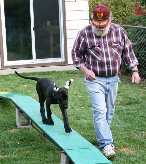 Gabby and Denny taking a little walk on the dogwalk in the backyard. She is a fast learner on this agility equipment. No fear here. Good girl!
