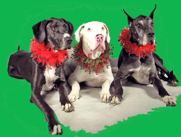 Carley, Isis and Horus in a Christmas picture. Good puppies!!!!! Carley is Lori Marthe's Great Dane. Isis and Horus belong to Leslie.