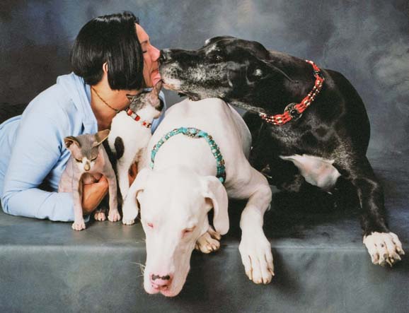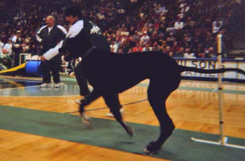 Horus is a Rescue dane that Leslie acquired through the Heart of Minnesota Great Dane Club. He came from Chicago and was being used for Pit Bull fights before being rescued . He has 3 years of Obedience and Agility training with titles in Novice, Open and Excellent. He also has his Canine Good Citizen title along with being a Therapy Dog at Regions Hospital. He has been a demo dog for Agility in parades and at one of our local sports teams, the Timberwolves, games. He ran in the Humane Society Run when he was 3 years old and had TPLO surgery when he was 4 years old. When Horus has time for fun, he likes driving the pontoon boat and sniffing flowers and taking walks through the woods. He is 9 years old now and enjoying life being a senior citizen. (2005)