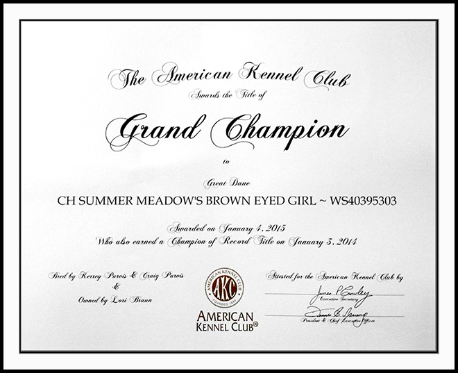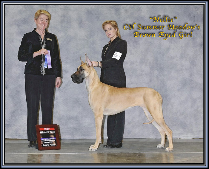 Summer Meadow's Brown Eyed Girl "Nellie" Owned by Lori and Mike Braun and bred by Kerrey Purvis. 3 point major Feb 17, 2013 under Judge Arley Hussin. Winners bitch, BOW and BOS Nellie is out of Hauer Danes, "Wally" and Kerrey's "Sammie".