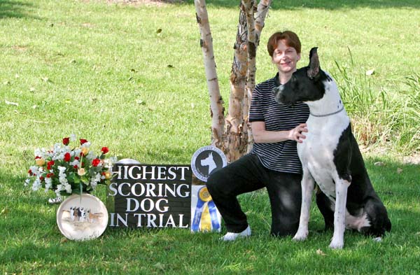 Nancy and Finney in Kansas City, KS, May 19, 2006 after winning High In Trial at the Greater Kansas City Great Dane Club Specialty.