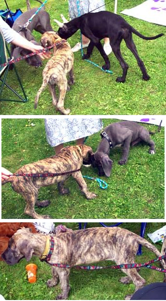 Lynn Cooch's pup Ashton (brindle) and Ann Heinrich's pup Gandalf, Sumner's Solar Fantasy (fawn)