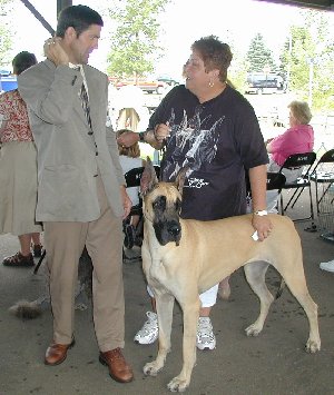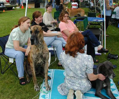 Joy Lobato ringside talking to Earl Shore with her CH Lobato's Anything Goes