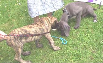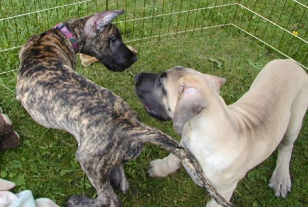 Lynn Cooch's pup Ashton (brindle) and Ann Heinrich's pup Gandalf, Sumner's Solar Fantasy (fawn)