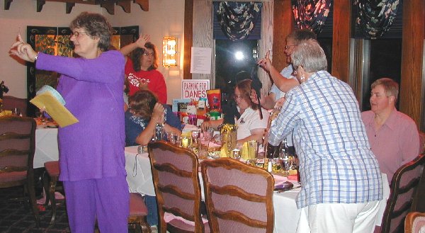 her hand raised, Lynn Cooch with her back to the camera and her friend