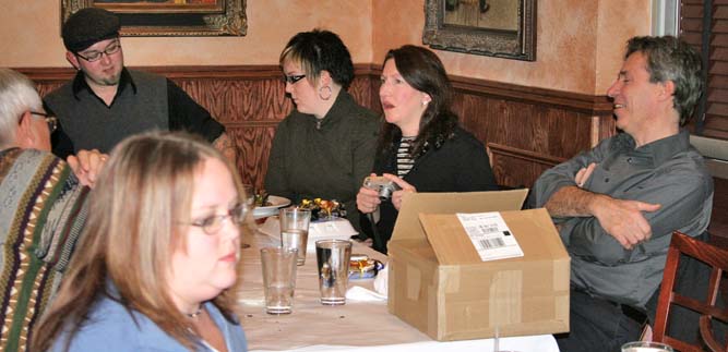 Diane Monson with her face behind Denny Land, Paul Meyer next to Diane, Julie Meehan and her husband Shaun, and Lynn Cooch on the other side of the table