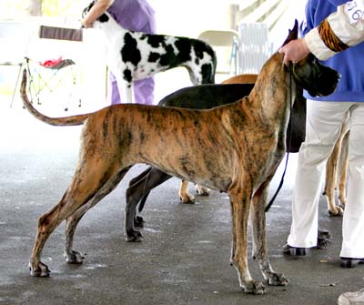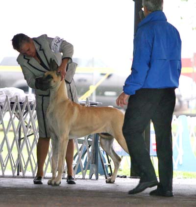 How many people, AND Great Danes, can you squeeze under a steel canopy in the rain at just one end of the ring? This photo was taken from the other side of the ring that we were SUPPOSED to be in, from under an E-Z Up awning. Do you see the rain coming down? Hey folks, you are looking the wrong way!! Over here! It's a test! How many people can you actually identify?