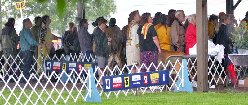 Our Judge, Bob Edison, made his own ring, UNDER the steel canopy. The hail was so loud you could hardly hear yourself think, let alone hear what the judge might have been trying to say to you. Just look at it rain!!! The lens on the camera was getting wet so I had to stop shooting for a while. (Mary Ann Land)